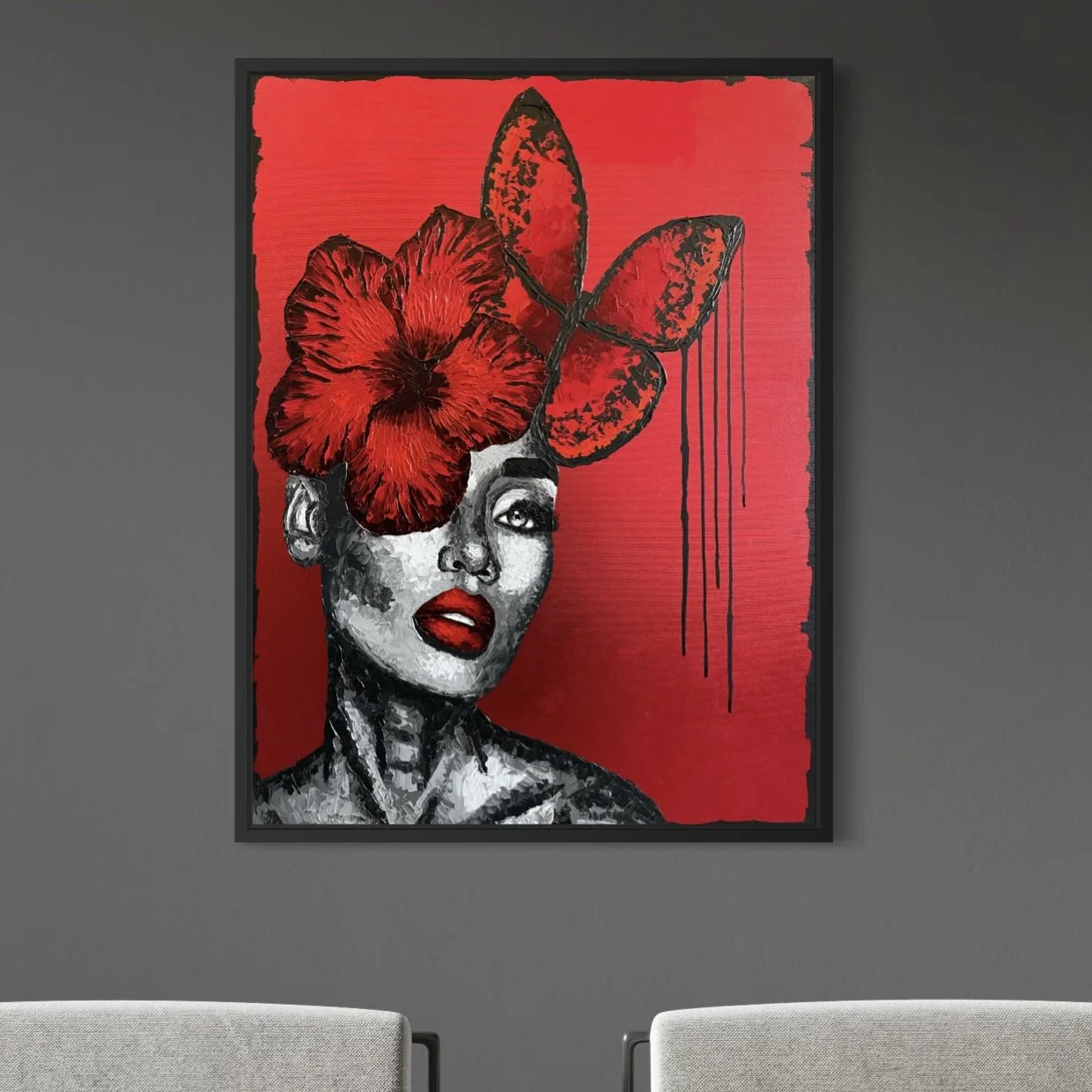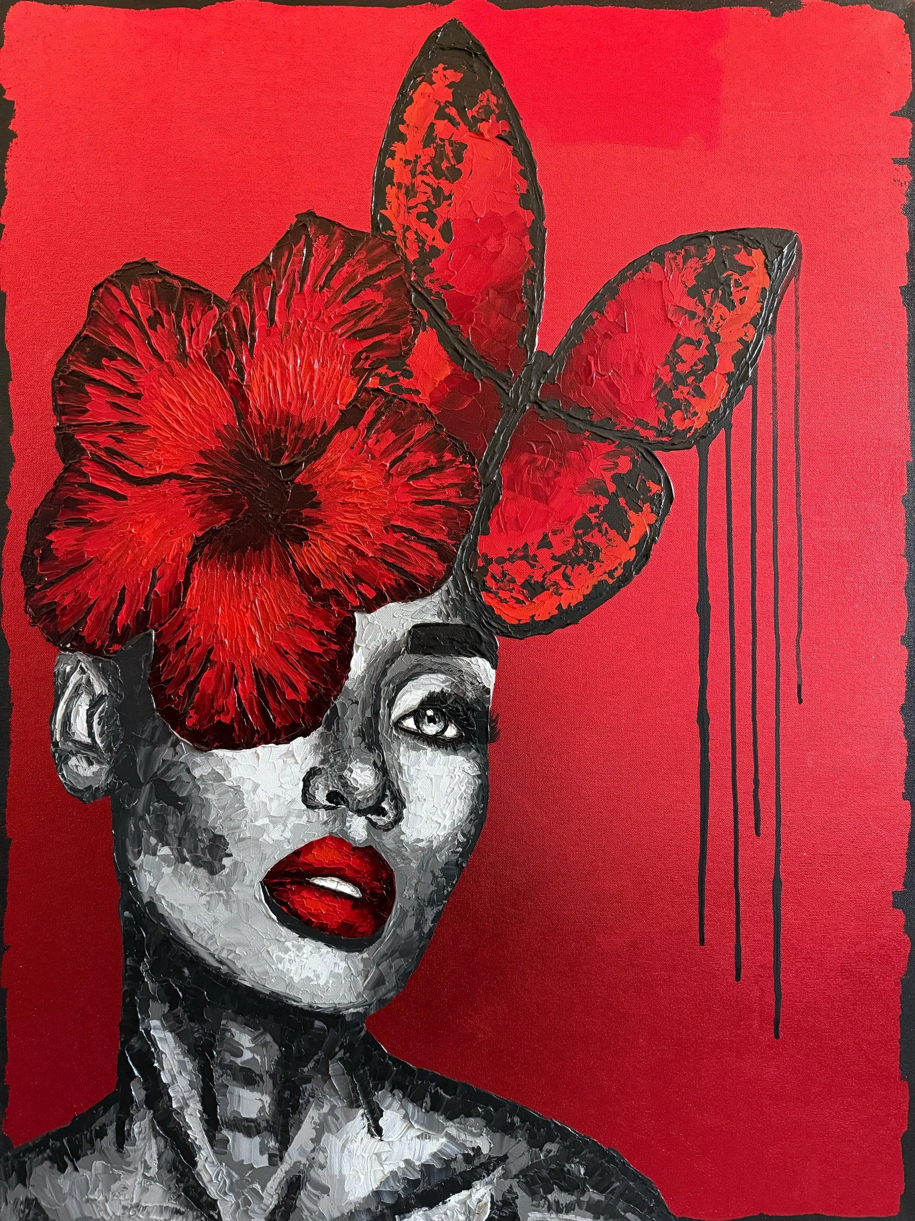 Materials: Acrylic and red foil on cotton canvas