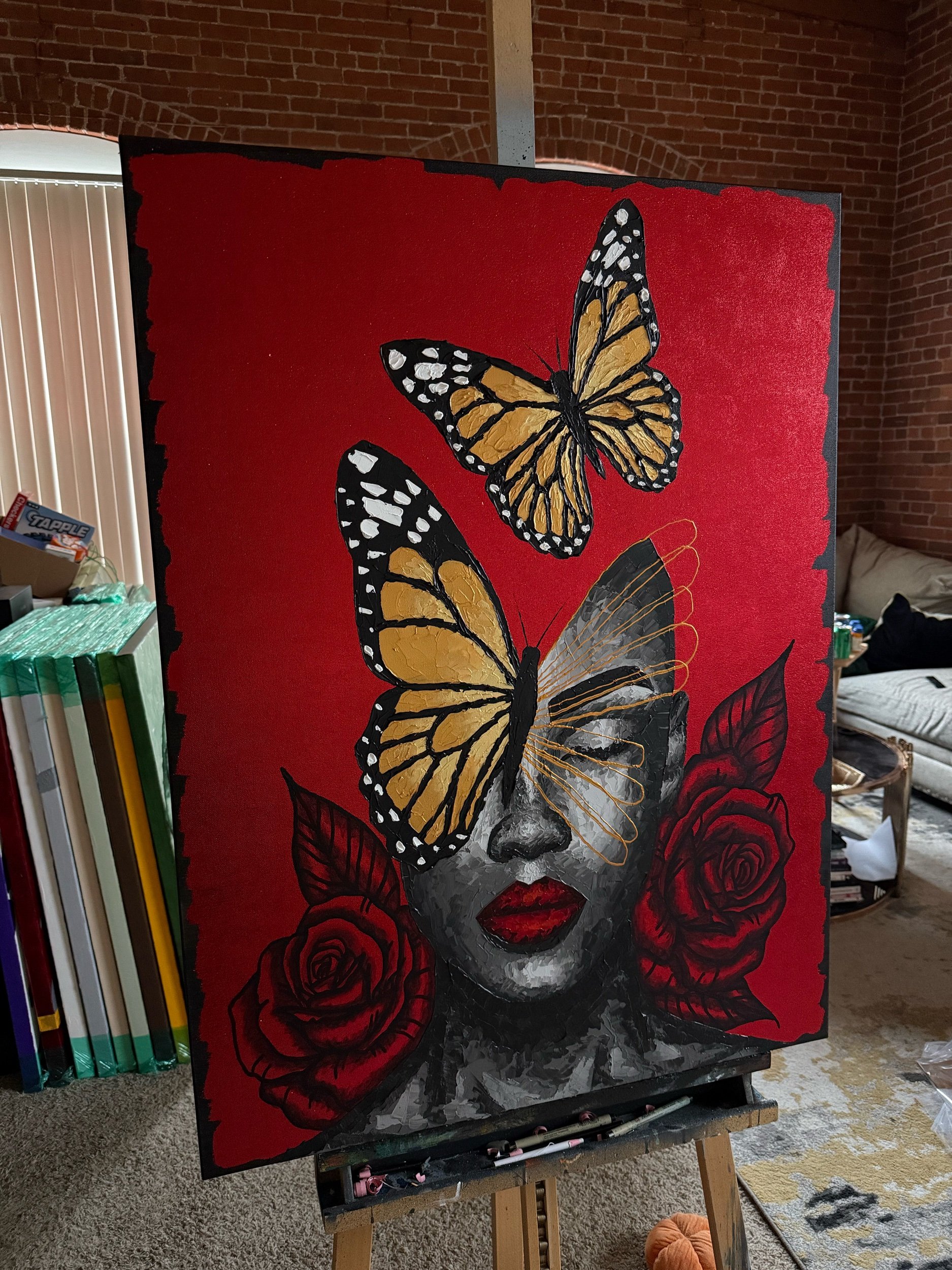 This work is delivered stretched onto frame.